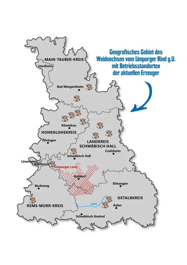 Seit Jahrhunderten sind die rotgelben Weideochsen im Leintal, den Limpurger Bergen, der Ostalb und dem Welzheimer Wald zuhause. Hier wachsen sie auf weiten, natürlichen Wiesen auf – langsam, stressfrei und immer in der Obhut nachhaltiger Familienbetriebe, die Tierwohl nicht versprechen, sondern leben.