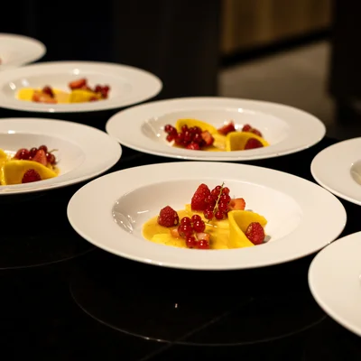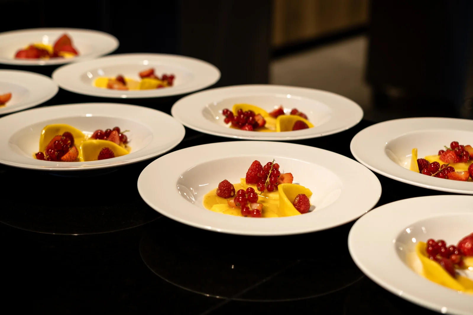 - sowie ein süßes Finale aus Schokolade, Champagner und Frucht, das den Abend elegant abrundet.