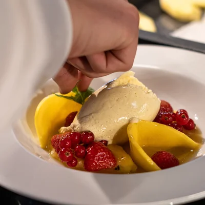 - Abgeschlossen wird der Abend von einem Dessert, das Schokolade, Champagner und Frucht elegant verbindet.