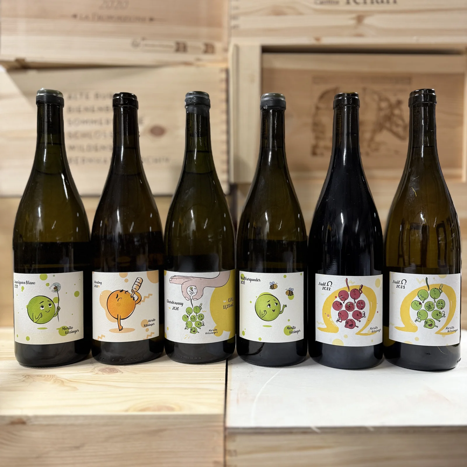 1x Sauvignon Blanc, 1x Riesling, 1x Chardonnay, 1x Weissburgunder, 1x Null Om Rot, 1x Null Om weiß